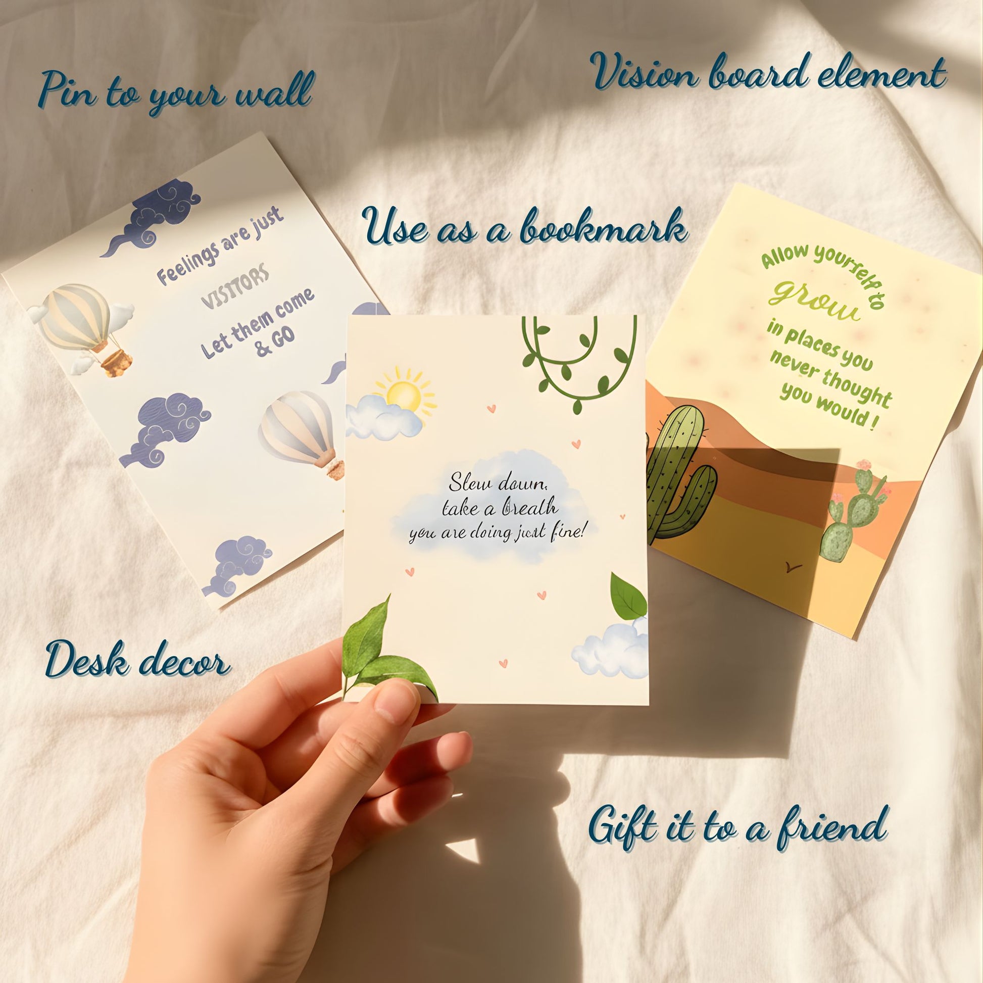 Thoughtfully designed in soothing colours, these postcards are perfect for pinning to your wall, slipping into a journal, gifting a friend, or keeping beside your workspace.